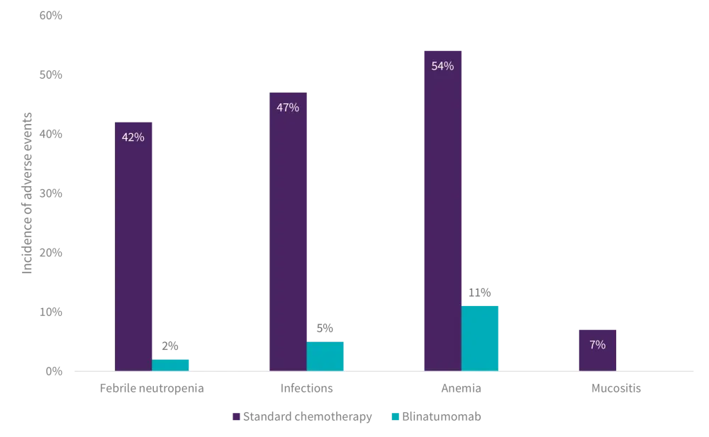 When comparing the rates of clinically significant adverse events, patients in the standard chemotherapy arm had strikingly higher rates of Grade III–IV febrile neutropenia, infection, sepsis, anemia, and mucositis relative to blinatumomab (Figure 2).