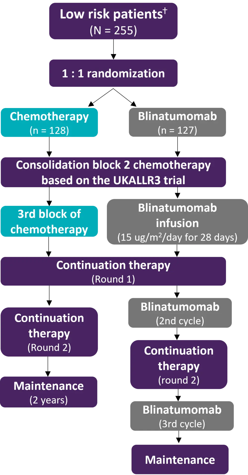 The study was conducted in 170 Children’s Oncology Group centers. In total, 255 low-risk patients were randomized from January 2015 to September 2019 (Figure 1). Any first relapse B-ALL patients aged 1–30 years regardless of remission duration were eligible to take part in the trial. Exclusion criteria included Down’s syndrome, Philadelphia chromosome positive ALL, prior transplant, and prior treatment with blinatumomab. The primary and secondary endpoints were intent-to-treat 4-year disease-free survival (DFS) from the time of randomization and overall survival (OS), respectively.