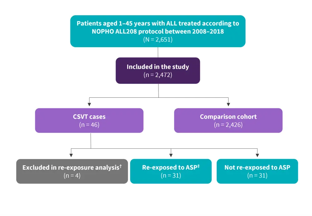 Below, we summarize the results of the NOPHO ALL2008 study (NCT00819351) evaluating ASP re-exposure after cerebral sinovenous thrombosis (CSVT) in pediatric and adult patients with ALL, recently published by Skipper, et al., in EJHaem.1