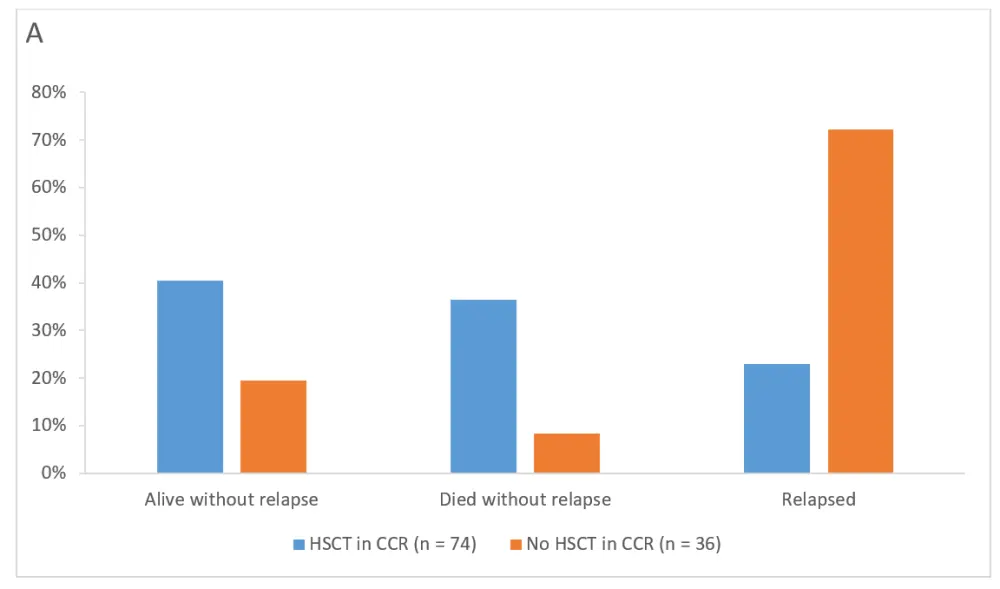 As shown in Figure 2, at the end of the follow-up study, 30 of 74 patients (40.5%) and 7 of 36 patients (19.4%) with and without HSCT in CCR, respectively, were alive without relapse. Moreover, 27 of 74 patients (36.5%) and 3 of 36 patients (8.3%) patients with and without HSCT in CCR, respectively, died without relapse. Among complete MRD responders, 28 of 61 patients (45.9%) and 7 of 23 patients (30.4%) with and without HSCT in CCR, respectively, were alive without relapse. Among those complete MRD responders, 20 of 61 patients (32.8%) with HSCT and 2 of 23 patients (8.7%) without HSCT died without relapse.