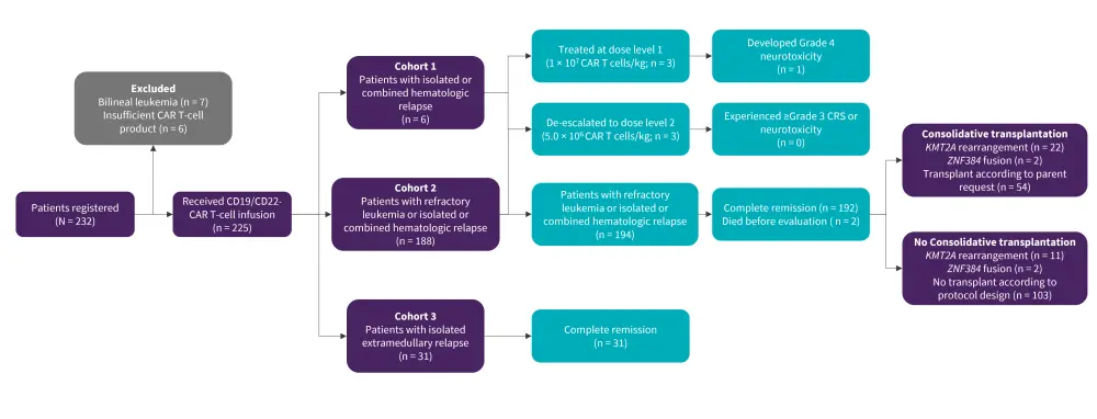 This was a phase II, open-label, multicenter study in children aged ≤21 years with R/R B-ALL. Patients received CD19-/CD22-CAR T-infusion (n = 225) and were separated into three cohorts (Figure 1).