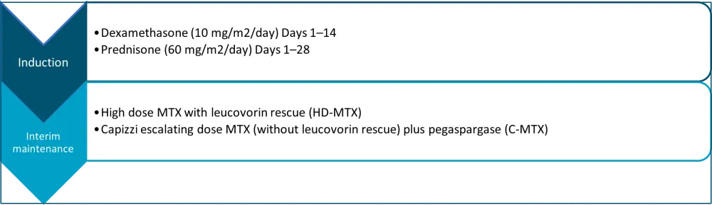 Patients enrolled in AALL0232 were randomized to receive dexamethasone or prednisone during induction and high dose MTX with leucovorin rescue (HD-MTX) or Capizzi escalating dose MTX (without leucovorin rescue) plus pegaspargase (C-MTX) during interim maintenance (IM) (Figure 1). Early responses were used to stratify patients and included: