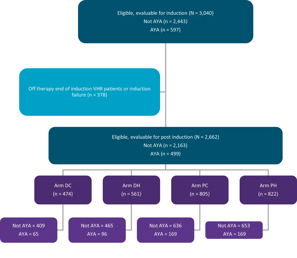 AYA, adolescent and young adults; DC, dexamethasone/C-MTX; DH, dexamethasone/high dose methotrexate with leucovorin rescue; PC, Prednisone/ Capizzi escalating dose MTX (without leucovorin rescue) plus pegaspargase; PH, Prednisone/ high dose methotrexate with leucovorin rescue; VHR, very high risk.
