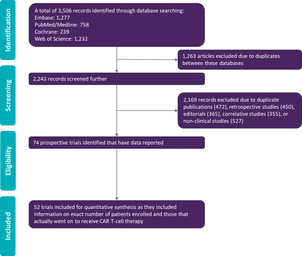 Mohyuddin et al. performed a systematic review of CD19 and BCMA-targeting CAR T-cell therapy trials after searching queries in four databases: Web of Science, MEDLINE/PubMed, EMBASE, and Cochrane Registry of Controlled Trials. All prospective trials that enrolled at least two patients and were published between January 1, 2013, and November 1, 2020, were included. For CD19, all leukemia and lymphoma subtypes were included. Editorials, case reports, case series, and review articles were excluded.