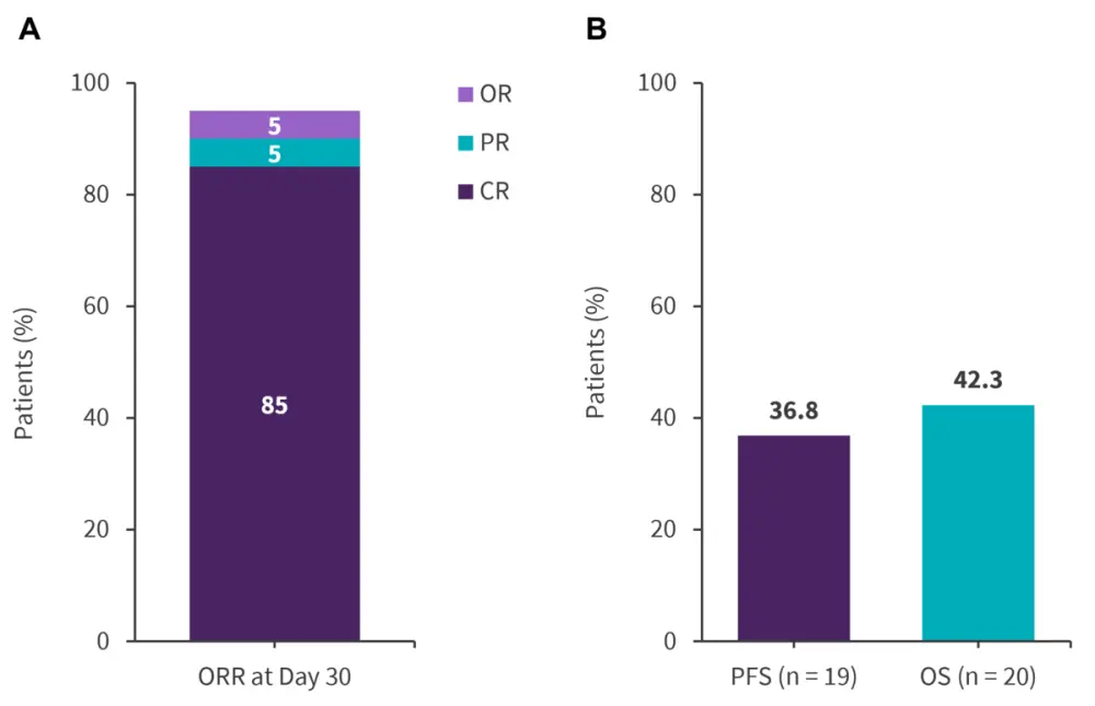 At Day 30, the treated population ORR was 95% (Figure 2A). One patient with partial remission (PR) at Day 30 achieved CR at Day 45. The median PFS was 11 months and the duration of response was 10.5 months (range, 6.4–12.0 months). The median OS was 18.3 months.