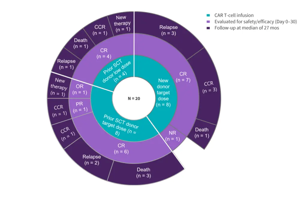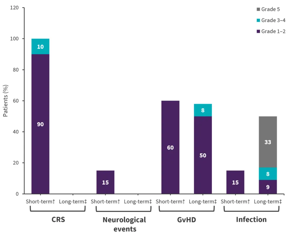 ‡AEs reported >30 days post-infusion in 12 patients who received prior-SCT donor-derived CAR T-cells but did not further undergo a SCT consolidation.