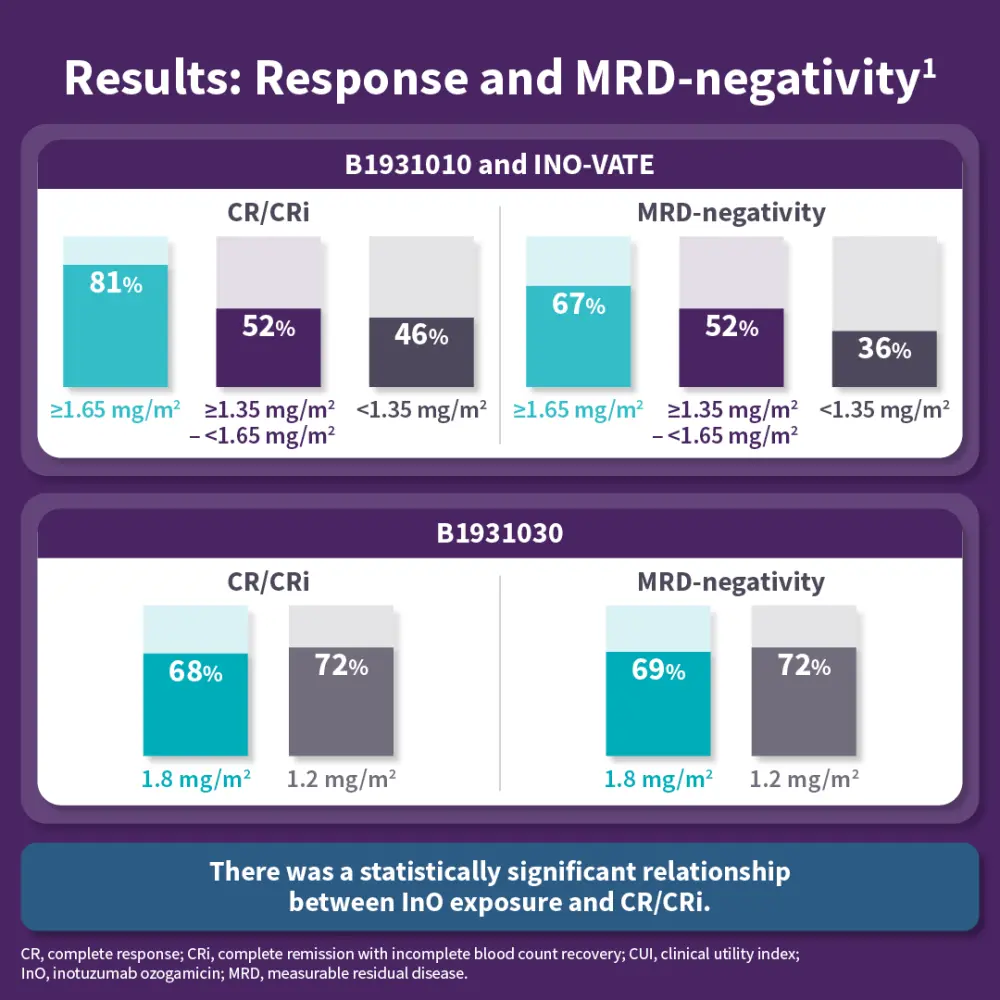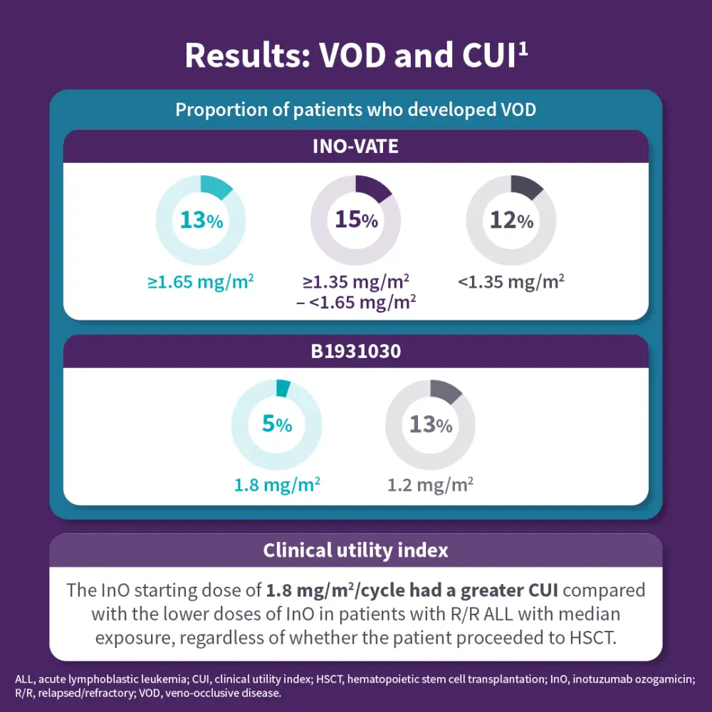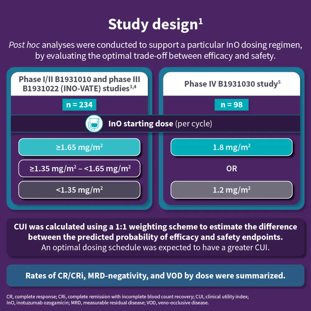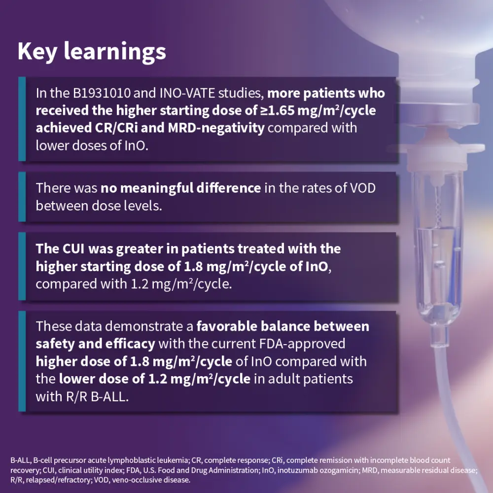 Inotuzumab ozogamicin was approved by the FDA and EMA in 2017 for the treatment of adults with relapsed/refractory CD22-positive B-cell precursor acute lymphoblastic leukemia. The FDA issued a post-marketing requirement due to concern that the proposed starting dose of 1.8 mg/m2/cycle of inotuzumab ozogamicin may not be optimal. The analysis, presented at ASH 2024 by DeAngelo, quantitatively measured the optimal trade-off between safety and efficacy using pooled data from the B1931010 and INO-VATE studies as well as data from the B1931030 study. These analyses support the current FDA-approved higher dose of 1.8 mg/m2/cycle, compared with the lower dose of 1.2 mg/m2/cycle, in balancing the efficacy and safety of inotuzumab ozogamicin in adult patients with relapsed/refractory acute lymphoblastic leukemia.
