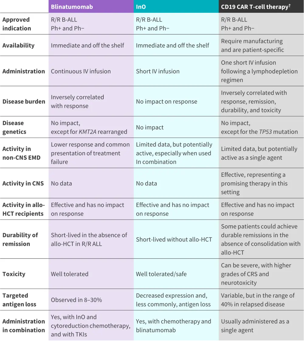 Practical considerations for the selection, sequencing, and combination of these novel immunotherapies (blinatumomab, InO, and CD19 CAR T cells) include, but are not limited to, disease burden, extramedullary disease (EMD), and safety profile (Figure 1). The advantages and limitations of each therapy are summarized in Figure 2.