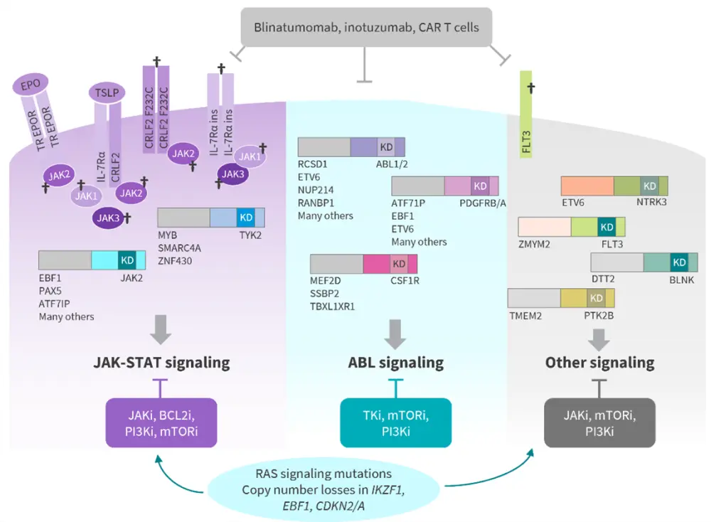 BCL2i, BCL2 inhibitors; CAR, chimeric antigen receptor; JAKi, JAK inhibitors; mTORi, mTOR inhibitors; Ph-like ALL, Philadelphia chromosome-like acute lymphoblastic leukemia; PI3Ki, PI3K inhibitors; TKi, tyrosine kinase inhibitors; TR, truncated.