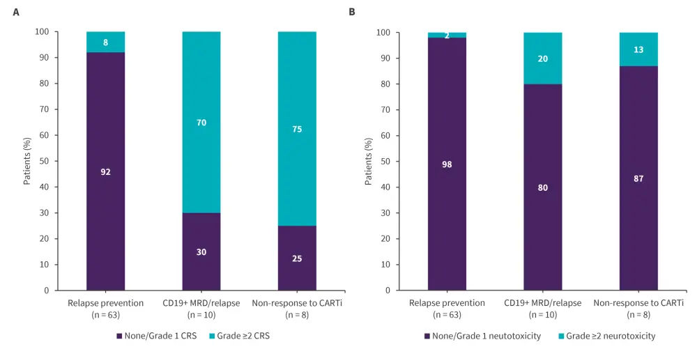 The incidence of cytokine release syndrome and neurotoxicity across all groups are reported in Figure 2A and 2B.