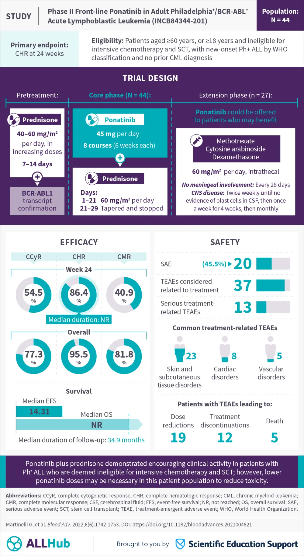 The ALL Hub is pleased to present a visual abstract representing key data from the phase II INCB84344-201 trial (NCT01641107) evaluating ponatinib plus prednisone as a firstline treatment for patients with Philadelphia chromosome-positive acute lymphoblastic leukemia (ALL) who are aged ≥60 years or considered ineligible for intensive chemotherapy and stem cell transplantation.