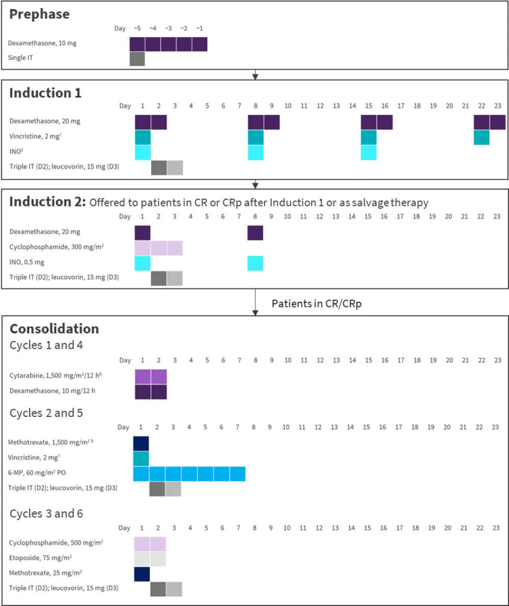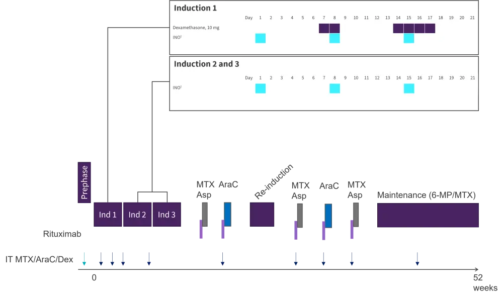 6-MP, 6-mercaptopurine; AraC, cytarabine; Asp, asparaginase; dex, dexamethasone; ind, induction; INO, inotuzumab ozogamicin; IT, intrathecal injection; MTX, methotrexate.