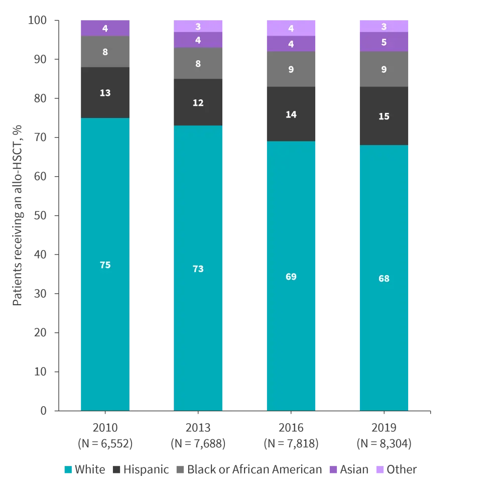 Since 2010, the number of patients receiving an allogeneic hematopoietic stem cell transplant (HSCT) has increased, but the proportion of patients from different ethnic groups has remained similar (Figure 4).