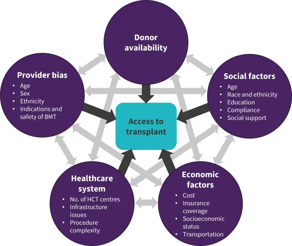 Examining different treatment and diagnostic options for patients undergoing bone marrow transplant (BMT) is an important part of improving outcomes. However, the wider context in which these transplants is occurring is also a crucial part of the equation and can exert great influence on the outcome of therapy. The race and ethnicity of patients can impact how likely a patient is to receive a BMT. The reasons for this are multifactorial and complex, covering a range of issues, including poverty, provider bias, healthcare infrastructure, and social factors (Figure 1).1