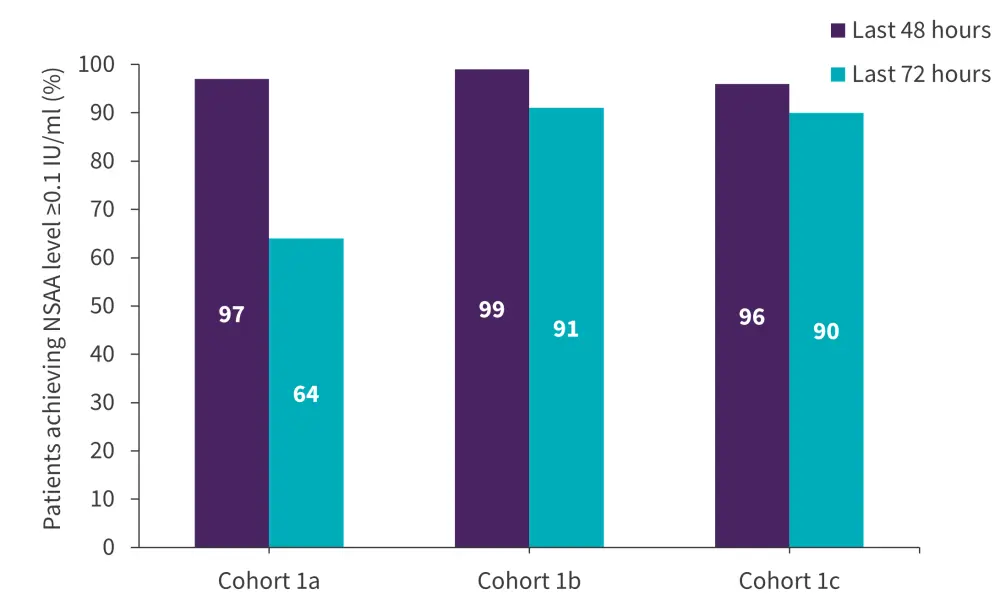 The patients were grouped into three cohorts: 1a, 25 mg/m2 on Monday, Wednesday, and Friday (MWF); 1b, 37.5 mg/m2 MWF; 1c, 25/25/50 mg/m2 MWF. The proportion of patients achieving NSAA level ≥0.1 IU/mL was similar across all cohorts in the last 48 hours but was higher in Cohorts 1b and 1c compared with Cohort 1a in the last 72 hours (Figure 3)8.