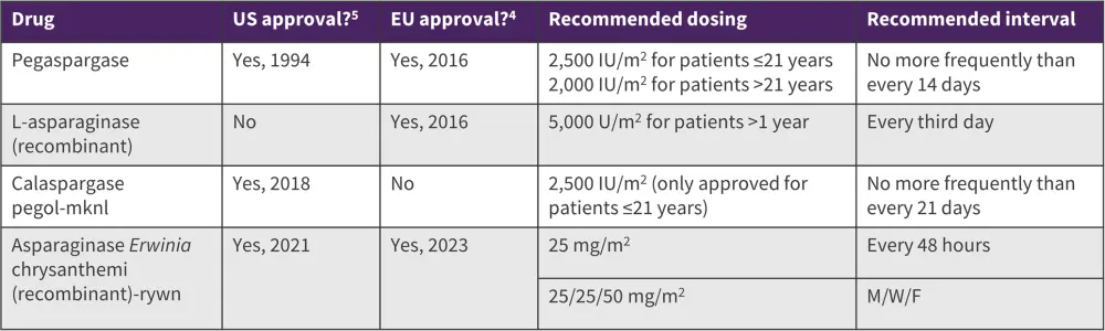There are multiple asparaginase products used regularly in the treatment of ALL in the US; availability of asparaginase can vary in other countries, with an additional recombinant E.coli derived L-asparaginase product used in Europe (Table 1).4