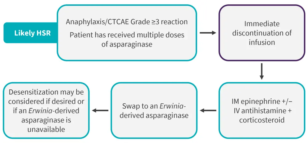 TDM can also assist in differentiating between antibody-mediated HSRs and infusion reactions, which can inform treatment decisions.6 With any severe reactions, infusions should be stopped, and further treatment will be determined by the type of reaction; if an HSR is likely, switching to an Erwinia-derived asparaginase is recommended, for example see suggested evidence-based recommendations from the Children’s Oncology Group (Figure 2)1. Where Erwinia-derived asparaginase is unavailable, patients with HSRs can undergo drug desensitization with E. coli-derived asparaginases.2 Recommendations can vary between clinics and countries, although consensus guidelines recommend switching asparaginase therapy in patients who experience HSRs, antibody-mediated reactions, or silent inactivation.2