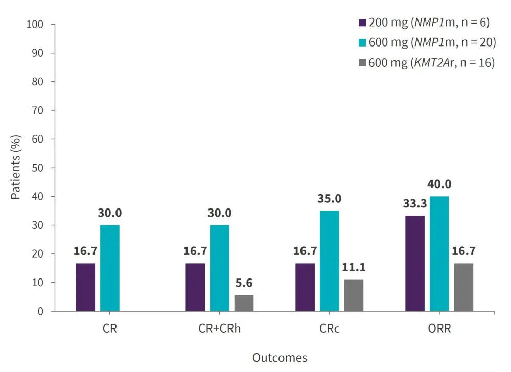 CR, complete remission; CRc, composite complete remission; CRh, complete remission with partial hematologic; KMT2Ar, KMT2A rearrangement; NPM1m, NPM1 mutation; ORR, overall response rate.