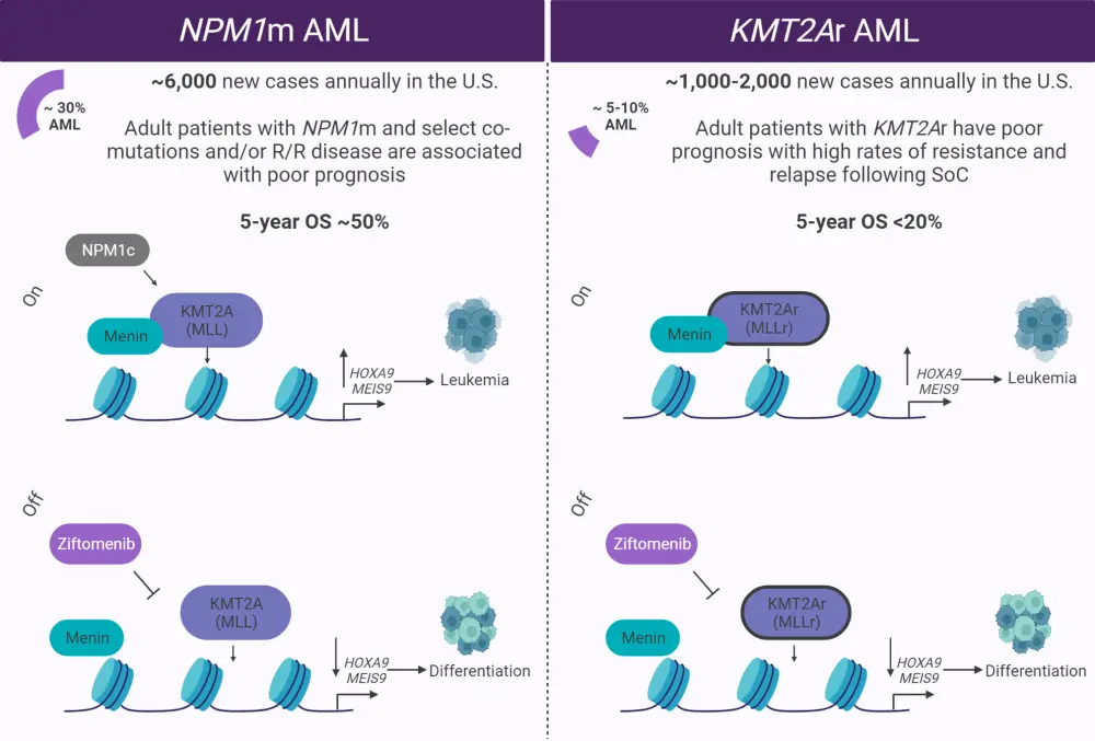 Rearrangements in the KMT2A gene (KMT2Ar) are present in 5–10% of patients in the US diagnosed with acute myeloid leukemia (AML), and mutations in NPM1 (NPM1m) occur in ~30%.1 Moreover, ~10% of patients with acute lymphoblastic leukemia (ALL) and 80% diagnosed with infant ALL have KMT2Ar.2