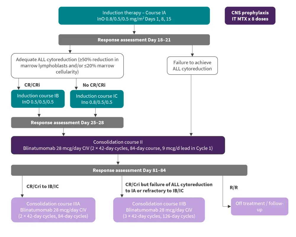 ALL, acute lymphoblastic leukemia; CIV, continuous intravenous infusion; CNS, central nervous system; CR, complete remission; CRi, complete remission with incomplete hematologic recovery; InO, inotuzumab ozogamicin; IT MTX, intrathecal methotrexate; R/R, relapsed/refractory.