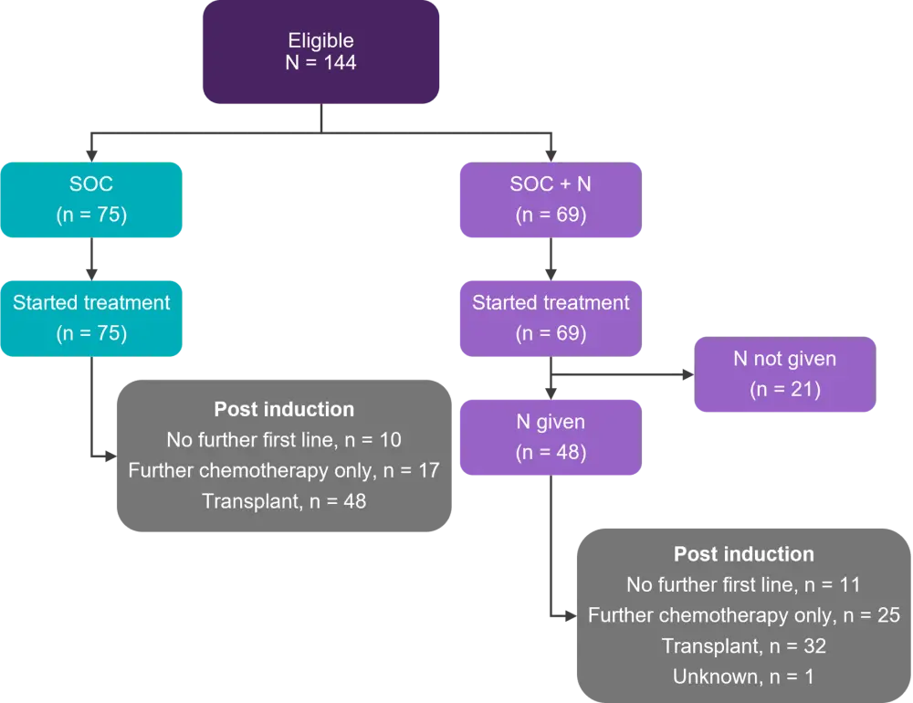 A total of 144 patients were included, 75 in SOC group and 69 in the SOC + nelarabine group, respectively. Twenty-one patients were not given nelarabine in the SOC + nelarabine group mainly due to persistent treatment-related toxicity (Figure 2).