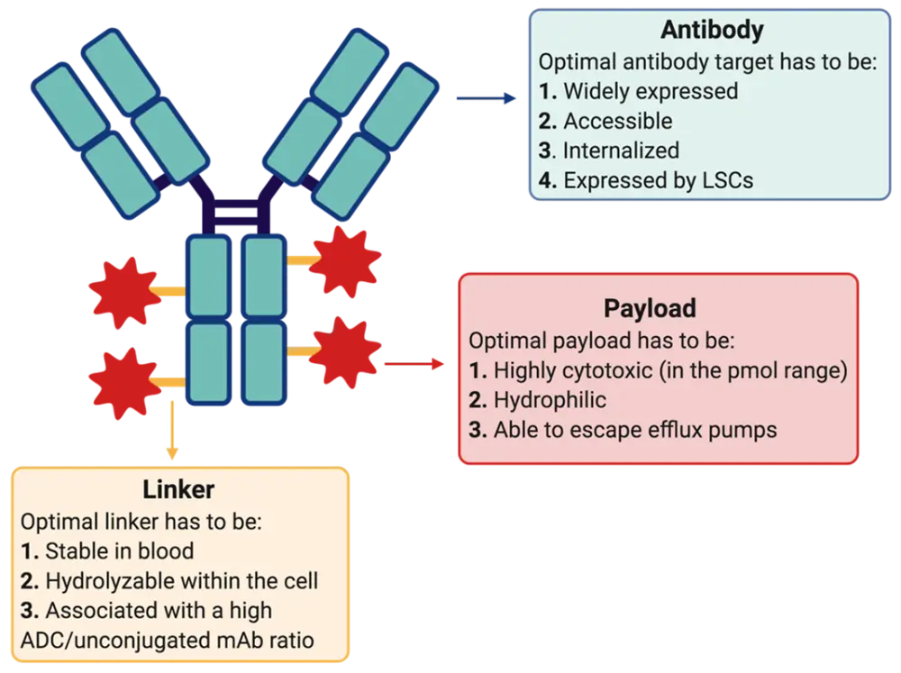 The three most critical components in the development of novel active ADCs are the target, the linker, and the conjugated payload. An optimal target should be specific, accessible, widely expressed, internalized, and expressed by leukemic stem cells (Figure 1). Among multiple suggested ADC targets for AML, the most widely used are CD33 and CD123. Although they are both expressed by leukemic cells, they are also expressed by normal hematopoietic stem cells, explaining the observed myelosuppression seen with anti-CD33 ADCs (i.e., GO) and highlighting the narrow therapeutic index of such ADCs. Other targets like IL-1RAP, expressed by leukemic cells but not by normal hematopoietic cells, are attractive candidates for novel ADCs.
