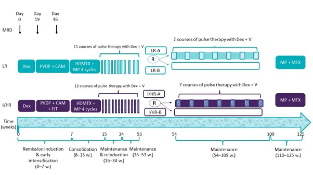 CAM, cyclophosphamide, ara-C, and mercaptopurine; Dex, dexamethasone; EIT, early intensification therapy; HDMTX, high-dose methotrexate; I/HR, intermediate to high risk; I/HR-A, I/HR control group; I/HR-B, I/HR experimental group; LR, low-risk; LR-A, LR control group; LR-B, LR experimental group; MP, mercaptopurine; MRD, minimal residual disease; MTX, methotrexate; PVDP, prednisone, vincristine, daunorubicin, and pegaspargase; R, randomized; V, vincristine; w, weeks.