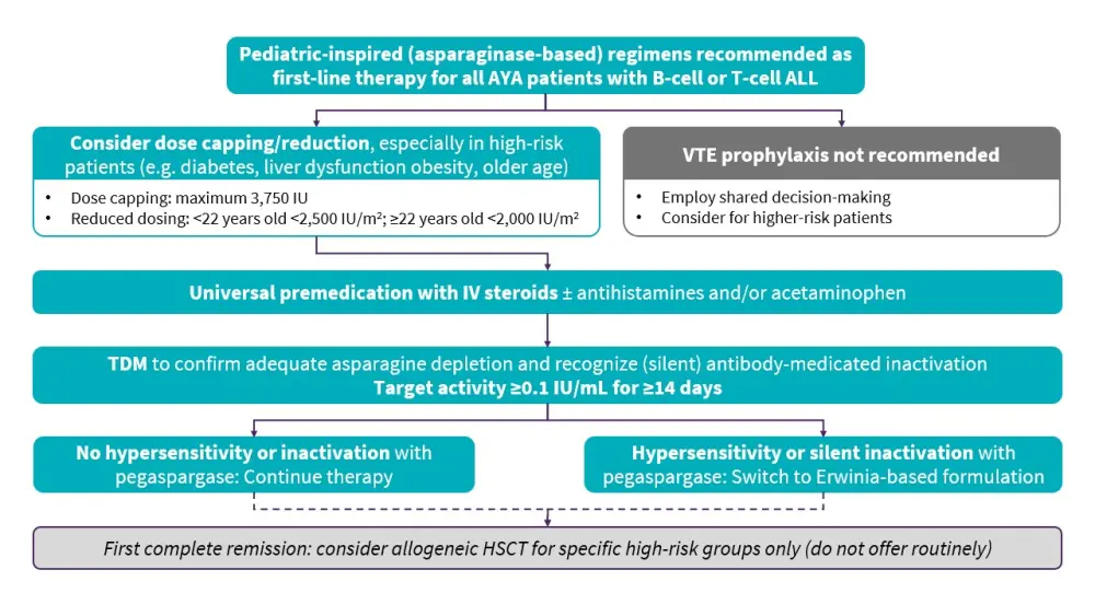 The new guidelines emphasize the central role of pediatric-inspired asparaginase-based regimens for first-line therapy, and provide guidance on practical measures such as universal premedication, TDM, and timely switching to Erwinia-based formulations. While the guidelines highlight further evidence needs, including prevention and treatment of asparaginase toxicity and the comparative effects of desensitization/rechallenge vs switching asparaginase formulations, these recommendations should support clinicians to optimize first-line therapy, thereby improving outcomes for AYA patients with both B-cell and T-cell ALL.