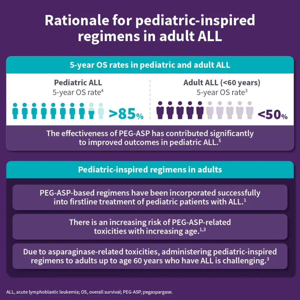 The success of pegylated asparaginase-based regimens in the treatment of pediatric acute lymphoblastic leukemia (ALL), alongside poor outcomes with conventional therapies in adults, has led to clinical trials of pediatric-inspired pegylated asparaginase-based regimens in adults with ALL. These trials have demonstrated the feasibility of pegaspargase-based regimens in adults. However, management of the toxicity profile of pegylated asparaginase-based protocols is key to mitigating treatment-related mortality and avoiding poor outcomes. Ongoing clinical trials are investigating novel formulations of pegylated asparaginases, such as calaspargase pegol, in adult patients with ALL.