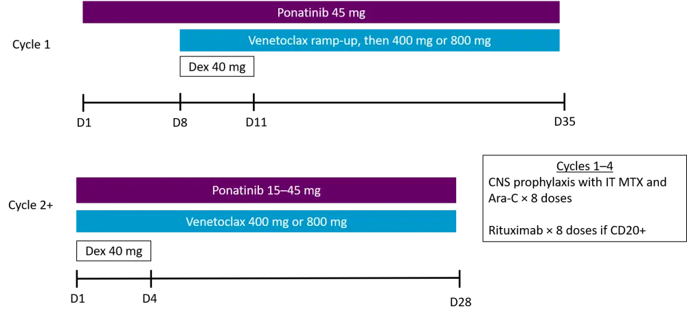 In Cycle 1, patients that had not received ponatinib in the last 2 weeks received 7 days of ponatinib monotherapy at 45 mg daily. On Days 8−11, ponatinib was given with venetoclax and dexamethasone as shown in Figure 1. Venetoclax was ramped up in Cycle 1 to 400 mg for dose level 1 and 800 mg for dose level 2. In Cycle 2 and subsequent cycles, ponatinib was decreased daily down to 30 mg if patients reached complete response (CR)/CR with incomplete hematological recovery (CRi) or to 15 mg if patients were in complete metabolic response (CMR). Central nervous system prophylaxis was given during Cycles 1−4, and rituximab was added if blast cells were CD20 positive.