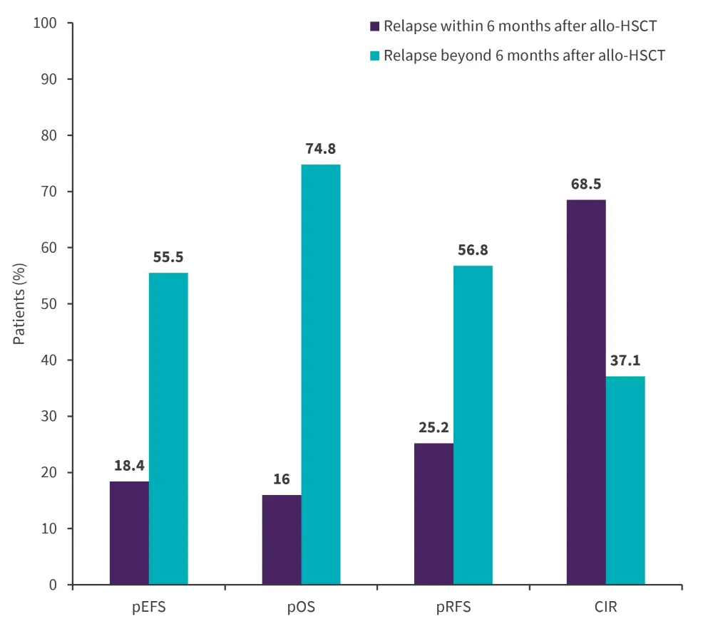 Patients who relapsed within 6 months of receiving an allo-HSCT had a median follow-up of 28.8 months; they also had a lower pEFS compared with those relapsing more than 6 months after allo-HSCT. Furthermore, pOS and pRFS were lower in patients who relapsed within 6 months of allo-HSCT compared with patients who relapsed more than 6 months following allo-HSCT. Treatment failure was mainly due to relapse, with the cumulative incidence of relapse being higher for patients who had relapsed within 6 months of allo-HSCT compared with those who had relapsed beyond 6 months (68.5% vs 37.1%; p = 0.026). A comparison between pEFS, pOS, PRFS, and cumulative incidence of relapse is shown in Figure 2.