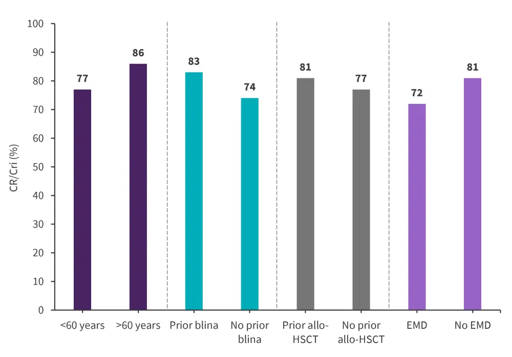 Among the efficacy evaluable patients, the overall CR/CRi rate was 79%, this rate was consistent across age, prior therapies, and the presence of extramedullary disease (EMD) (Figure 1). Among patients who were not in CR/CRi before brexu-cel infusion (n = 96), the CR/CRi rate was 66%.