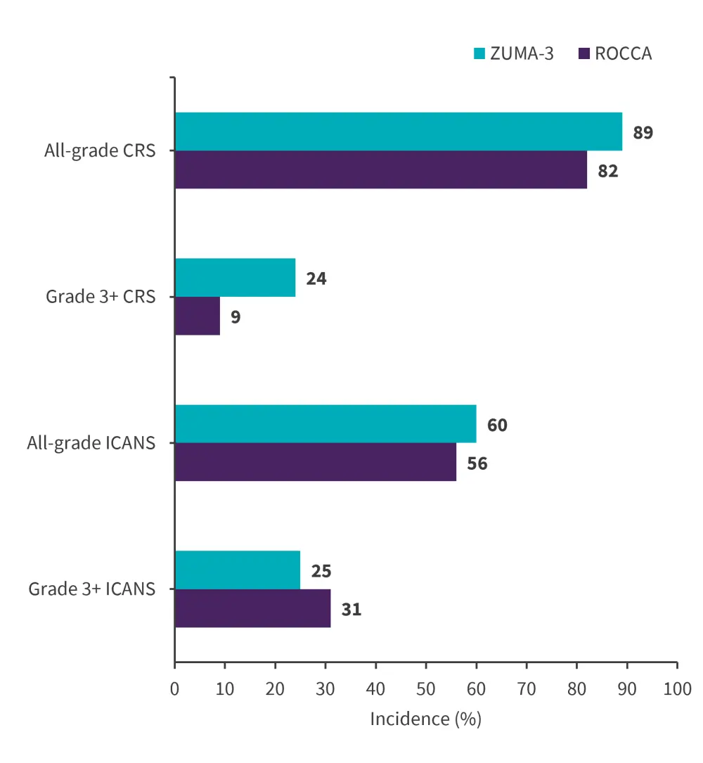 Figure 3. Incidence of CRS and ICANS in ZUMA-3 vs ROCCA*