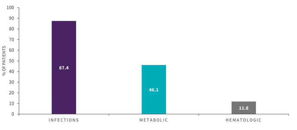 A total of 91% patients reported induction-related complications; infections and metabolic were the most common types (Figure 1).