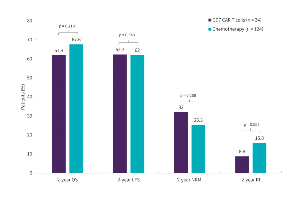 Figure 1. 2-year OS, LFS, NRM, and RI between CD7 CAR T-cell and chemotherapy groups*