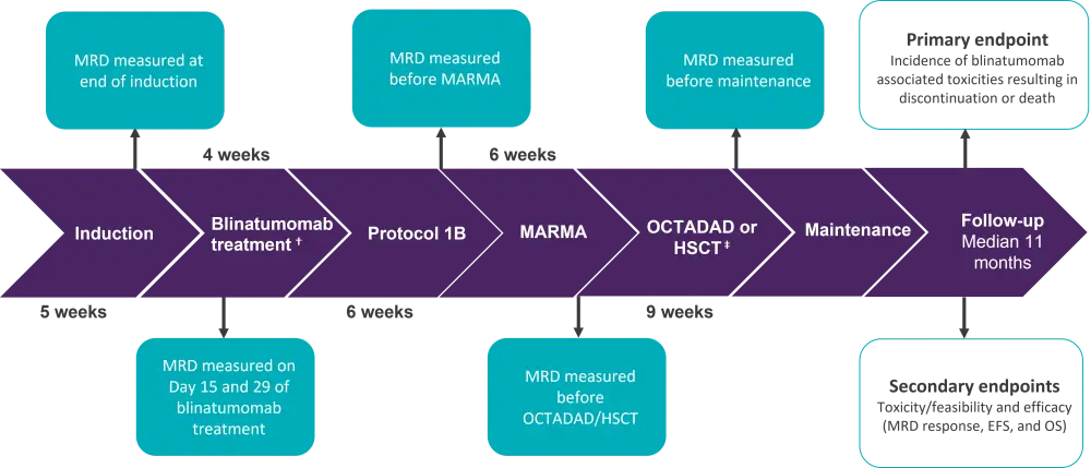 Infants (<1 year old) with acute lymphoblastic leukemia (ALL) have worse survival outcomes than older children, which is further pronounced with the presence of KMT2A rearrangement (KMT2A-r). KMT2A-r is common in infant patients (75%) and produces high rates of early relapse which is associated with reduced survival (20%). Improvements to frontline treatment are therefore of urgent need. One potential strategy is the use of blinatumomab, an anti-CD19 bispecific T-cell engager, which has previously demonstrated promising efficacy and safety in both older children and adult patients with ALL.1