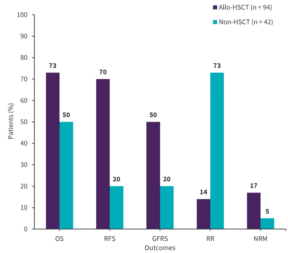 Allo-HSCT, allogeneic hematopoietic stem cell transplantation; GFRS, graft-versus-host disease-free survival; NRM, non-relapse mortality; OS, overall survival; RFS, relapse-free survival; RR, relapse rate