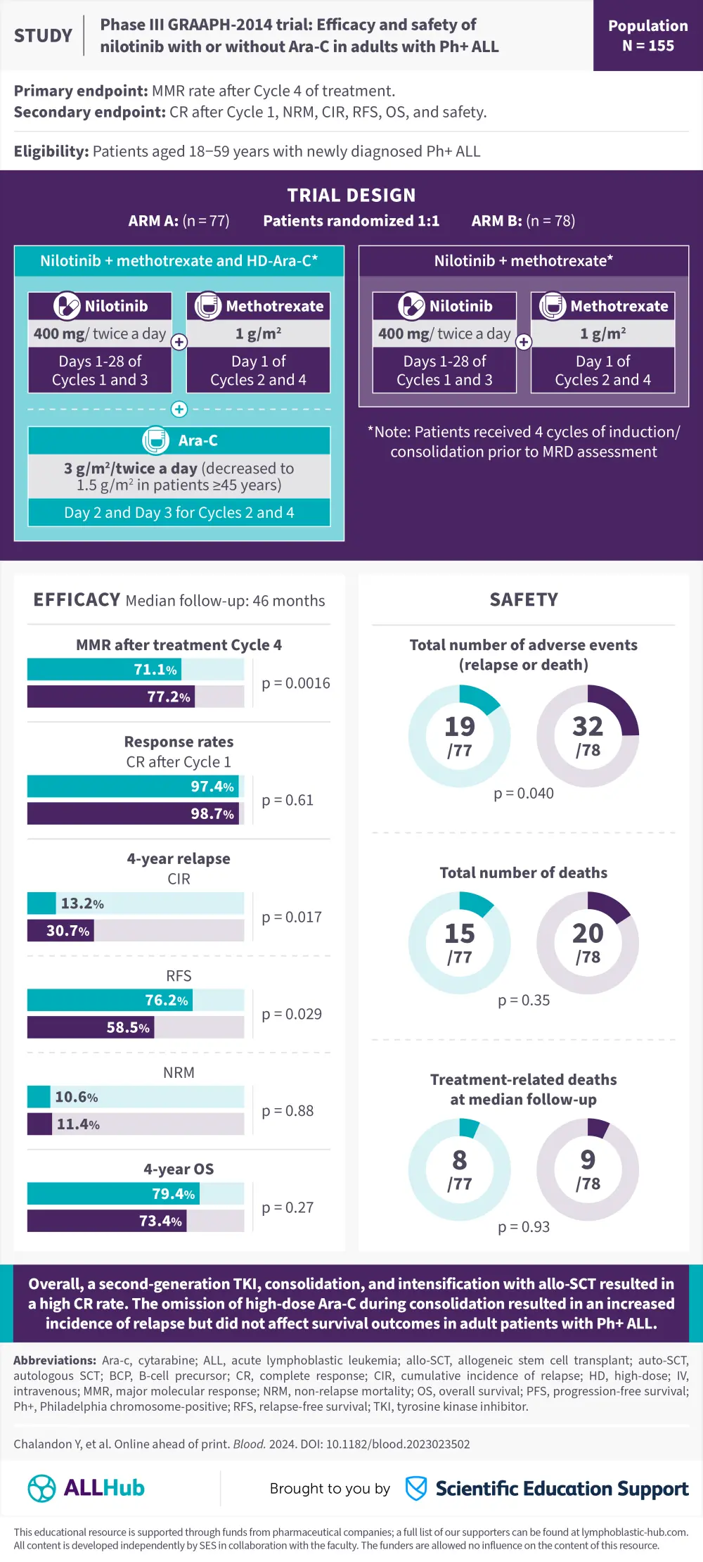 The ALL Hub is excited to present a visual abstract summarizing key data from the phase III GRAAPH-2014 trial (NCT02611492) comparing the efficacy and safety of nilotinib with or without high-dose cytarabine in adult patients with newly diagnosed Philadelphia chromosome-positive acute lymphoblastic leukemia.1