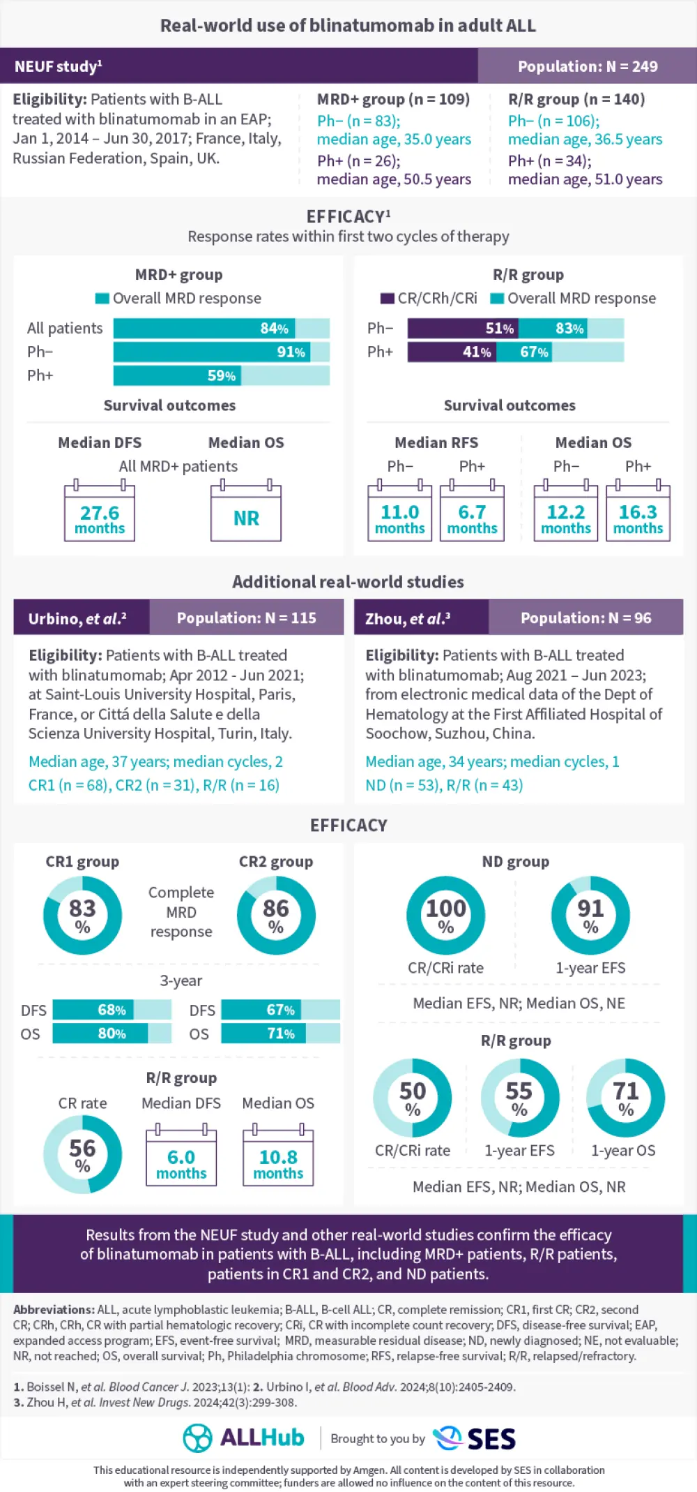 The ALL Hub is pleased to present a visual abstract summarizing results from the NEUF study and other real-world studies assessing the efficacy of blinatumomab in adult patients with B-cell acute lymphoblastic leukemia (B-ALL).